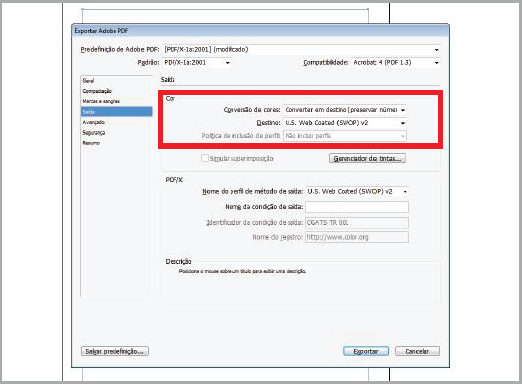 Neste janela, selecione a "Predefinição de Adobe PDF: [PDF-X1a:2001]"